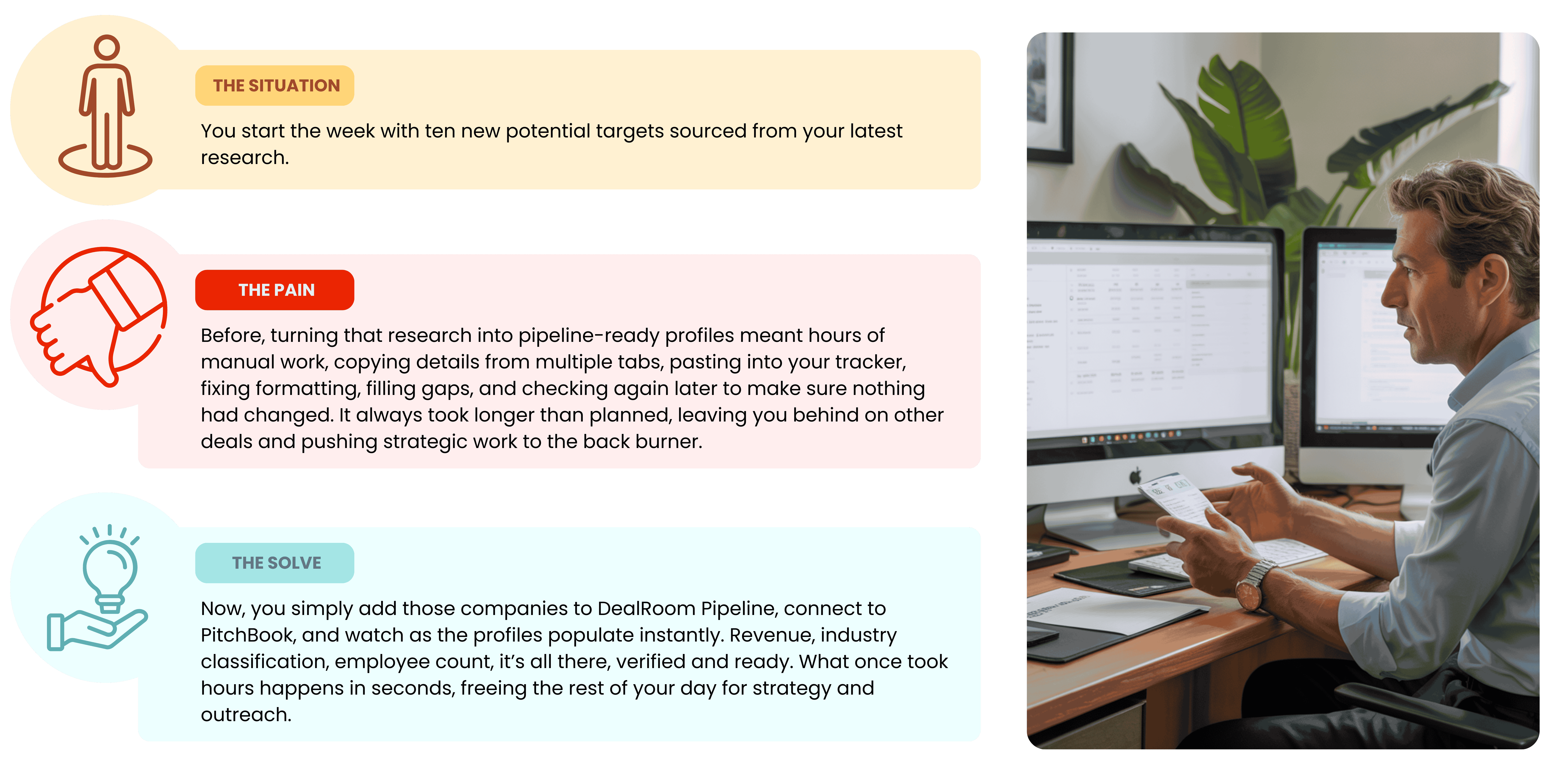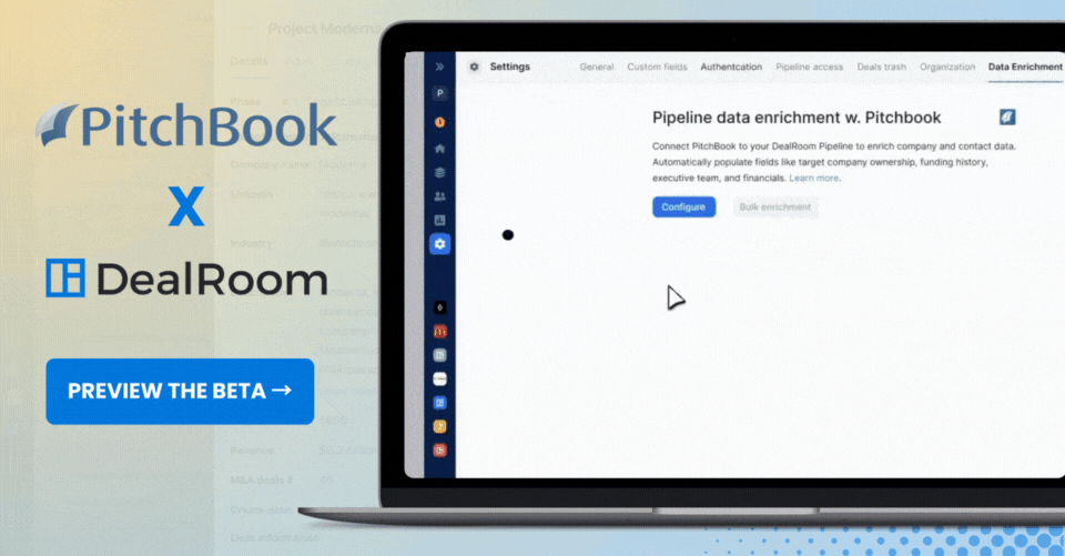 New DealRoom integration brings PitchBook’s trusted company data directly into DealRoom Pipeline —removing manual enrichment tasks and data gaps, so that acquisitive corp dev teams can build pipeline more efficiently