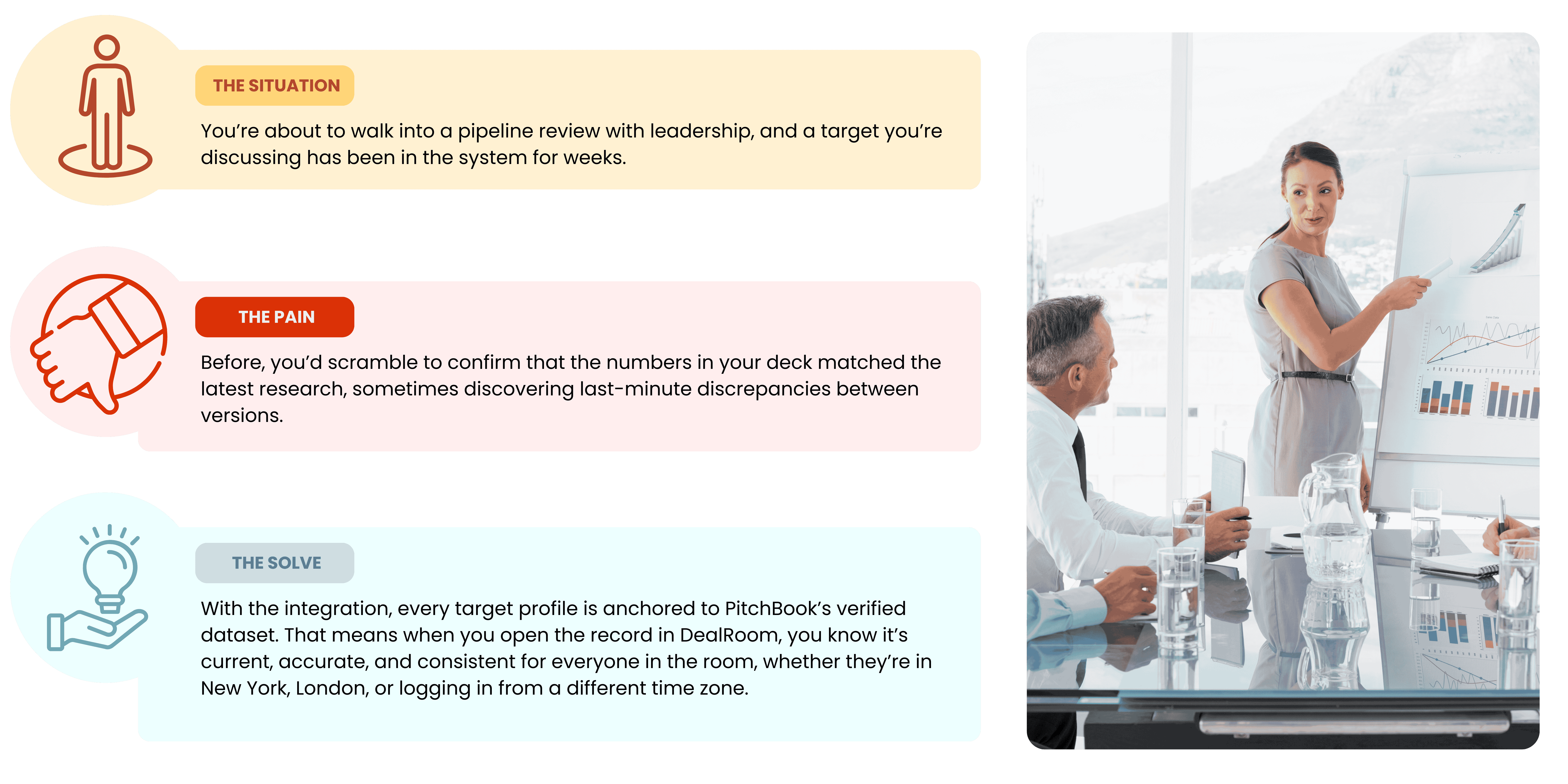 With the new DealRoom x PitchBook product integration, that entire bottleneck disappears.
