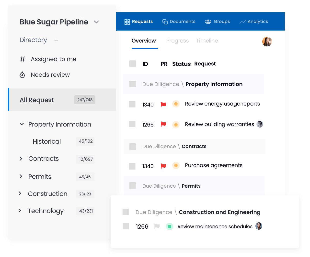 Control real estate due diligence up to 40% faster with requests capabilities. Complete all communication and diligence management eliminating emails, data rooms and disconnected technologies.