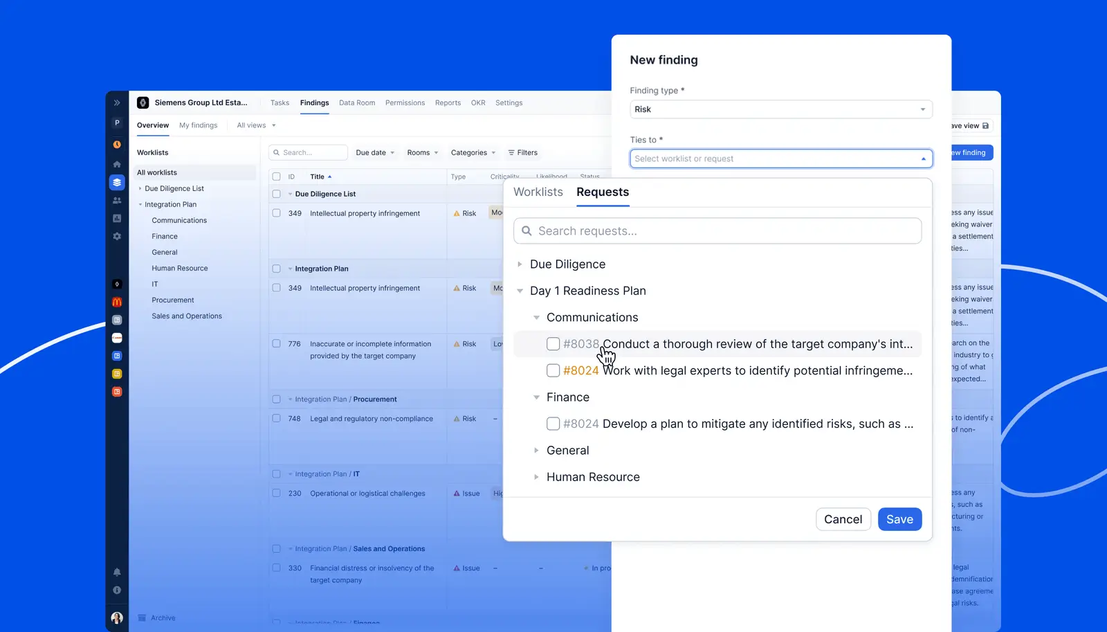 Effectively identify, track, and manage risks & findings to avoid integration delays