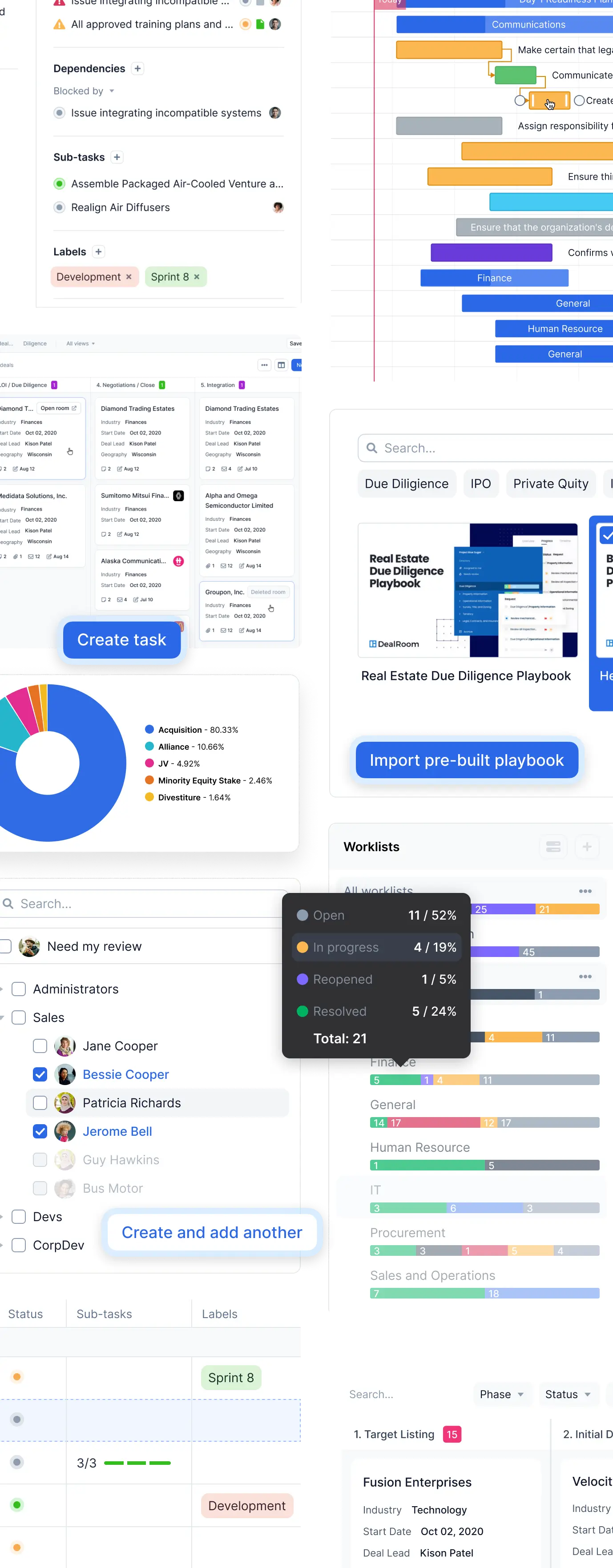 Project Management Diligence task creation, pre-made room templates, progress tracking, and in-platform communication | |||