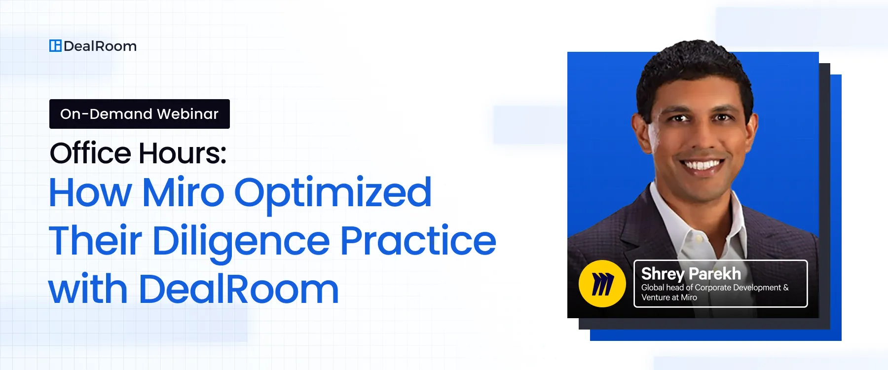 This session of our Office Hours series includes an intimate conversation & demo with Shrey Parekh, DealRoom customer and Global Head of Corporate Development and Venture at Miro. During this session Shrey will share insights into Miro's innovative approach to collaboration and how they have elevated their processes using the DealRoom Platform.