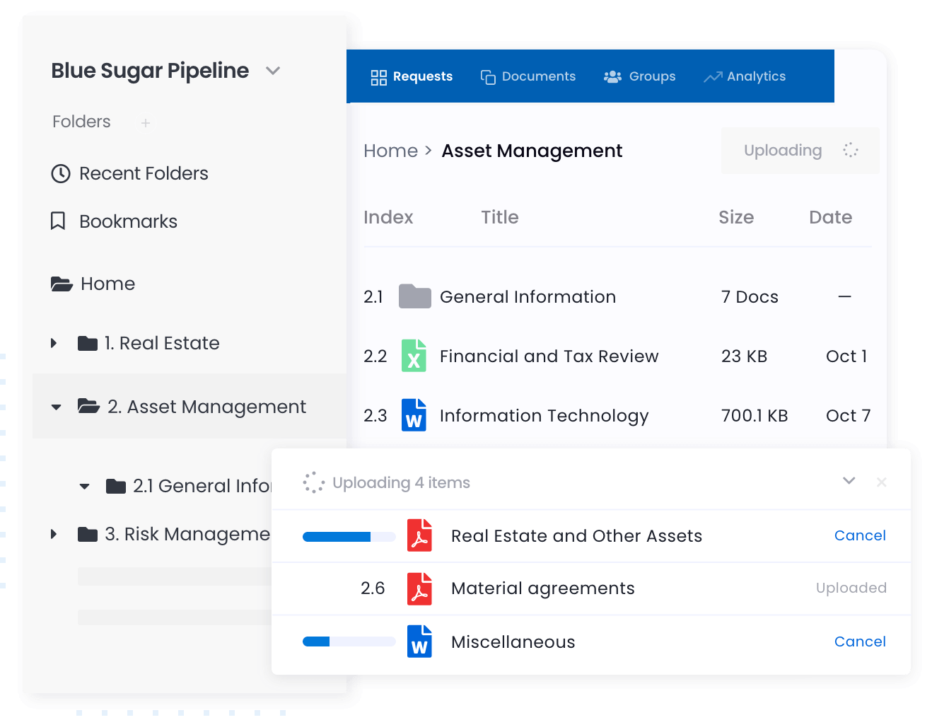 Your team can manage and complete the request within the room when the investment bank and investors have diligence requests. Diligence requests can also be tied to files in the platform’s data room.