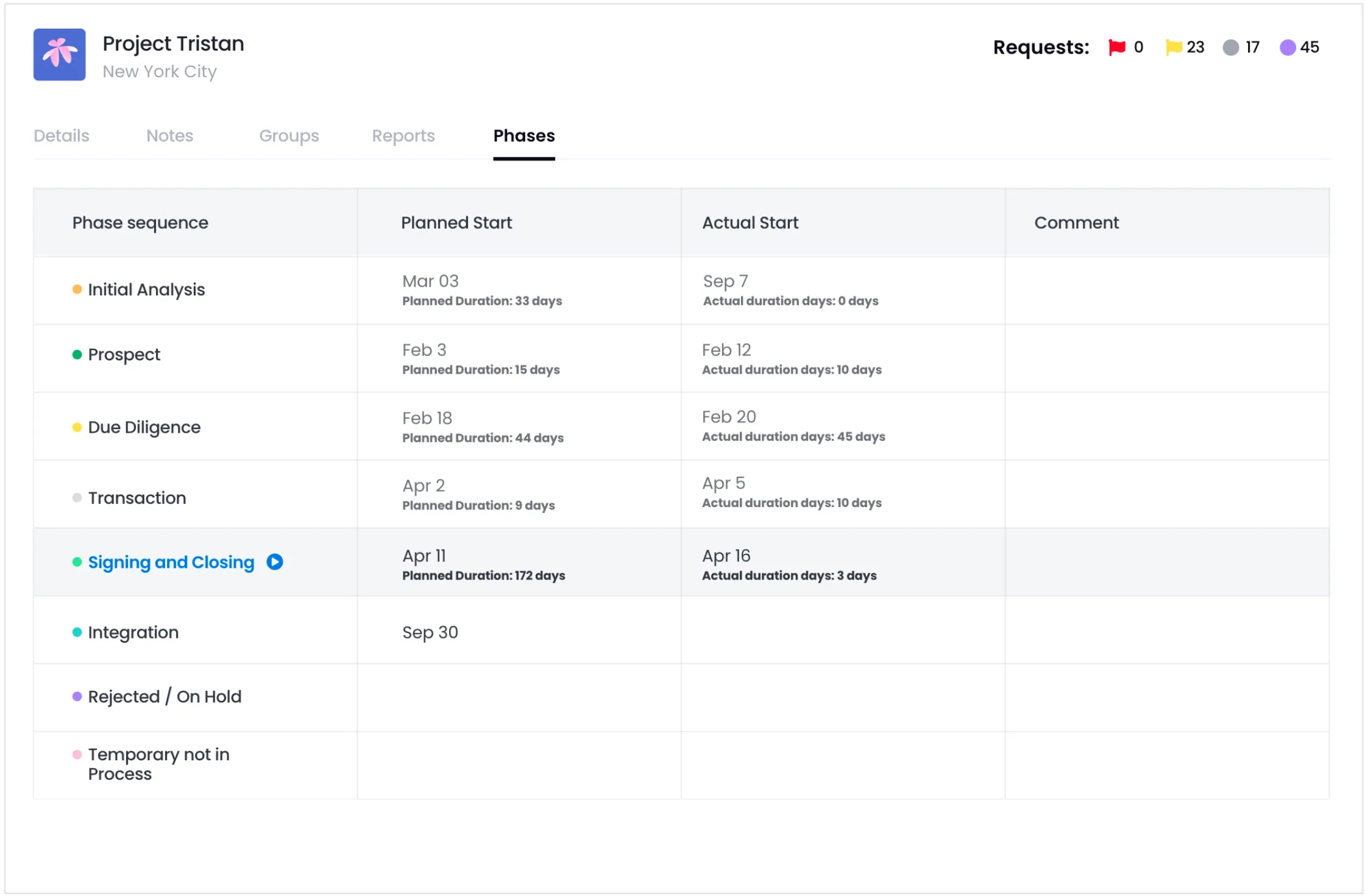 With the phases history feature, you can track deal progress, add planned vs. actual dates, take notes, and more.
