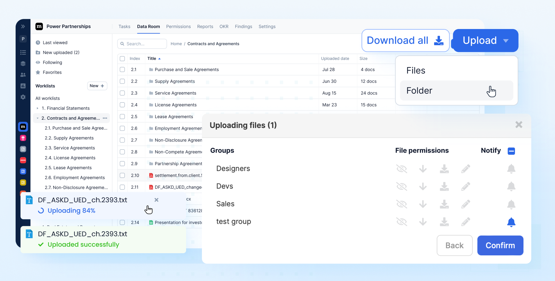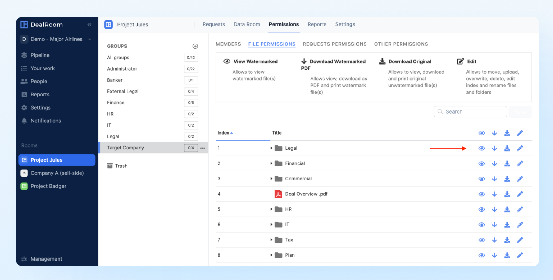 Take command of your data privacy and accessibility with DealRoom’s granular permission settings. Tailor access levels for different stakeholders, ensuring confidentiality and transparency throughout the deal lifecycle. For example-