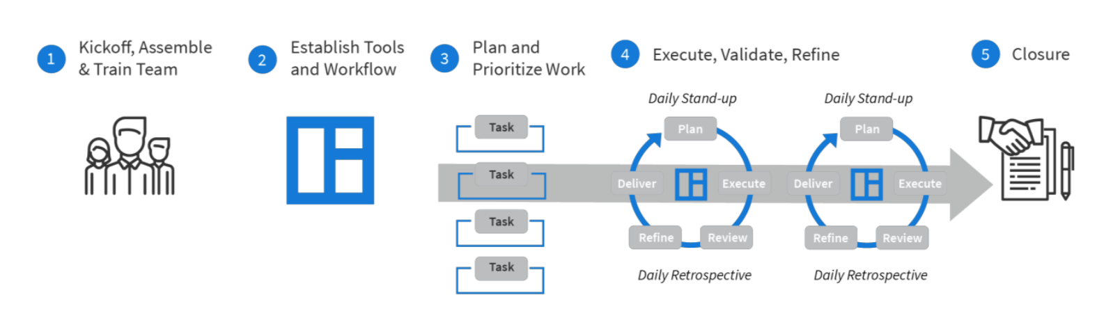 Guided by the principles of the Agile M&A manifesto, the Agile M&A process provides a tactical approach for planning and executing work while fostering a highly-collaborative, transparent, and constantly-improving team dynamic. This simple, intuitive, yet powerful approach allows teams to focus their efforts on completing critical tasks in pursuit of a timely and effective closing.