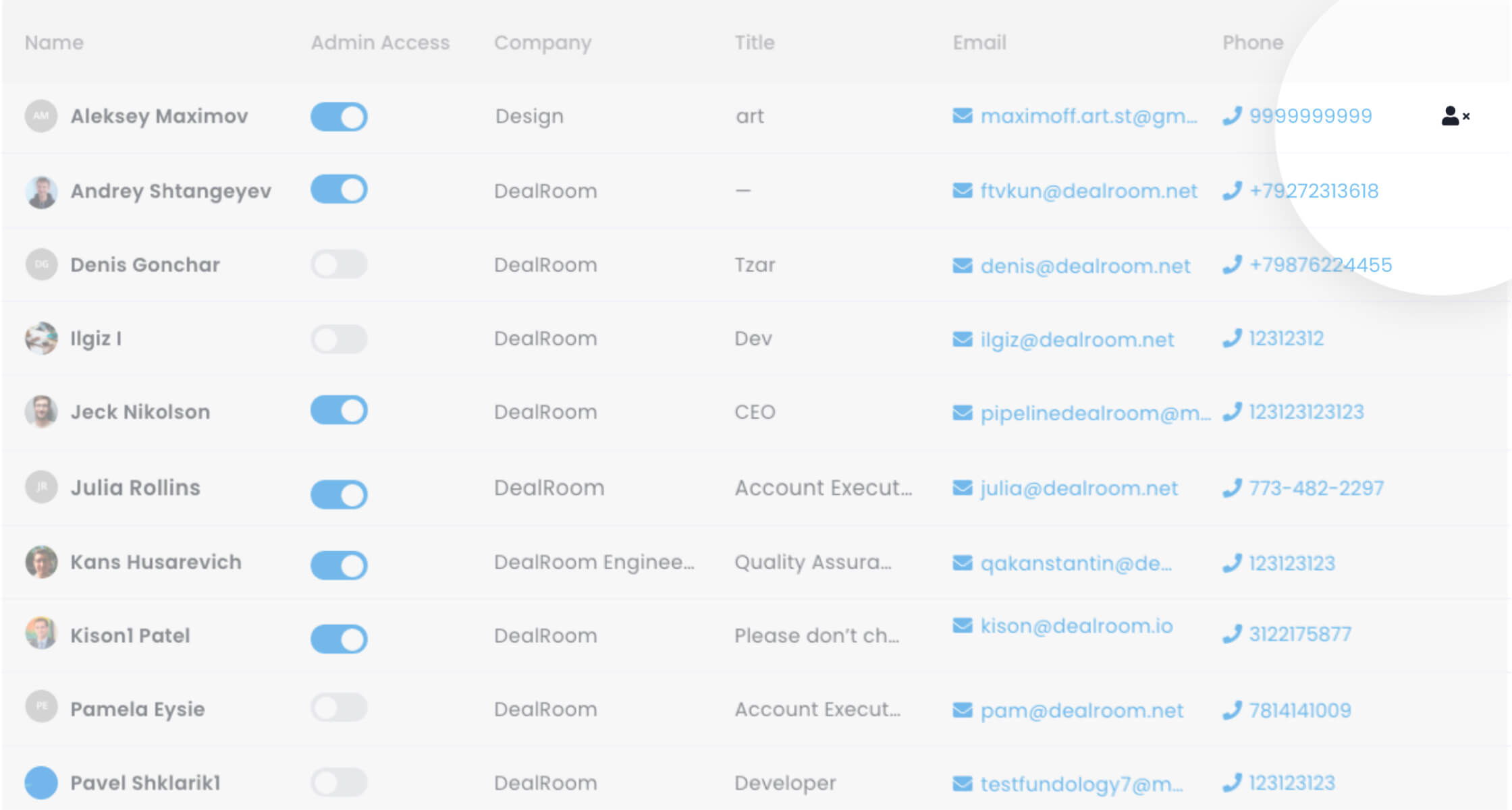 The deal pipeline access page is where admins can quickly see what type of access each user has to the pipeline. They can see users’ title, company, email, and phone number. From here, admins can also turn admin access on and off for other users, as well as grant deal pipeline access. Each user who has access to the pipeline is either a pipeline admin or pipeline general user.