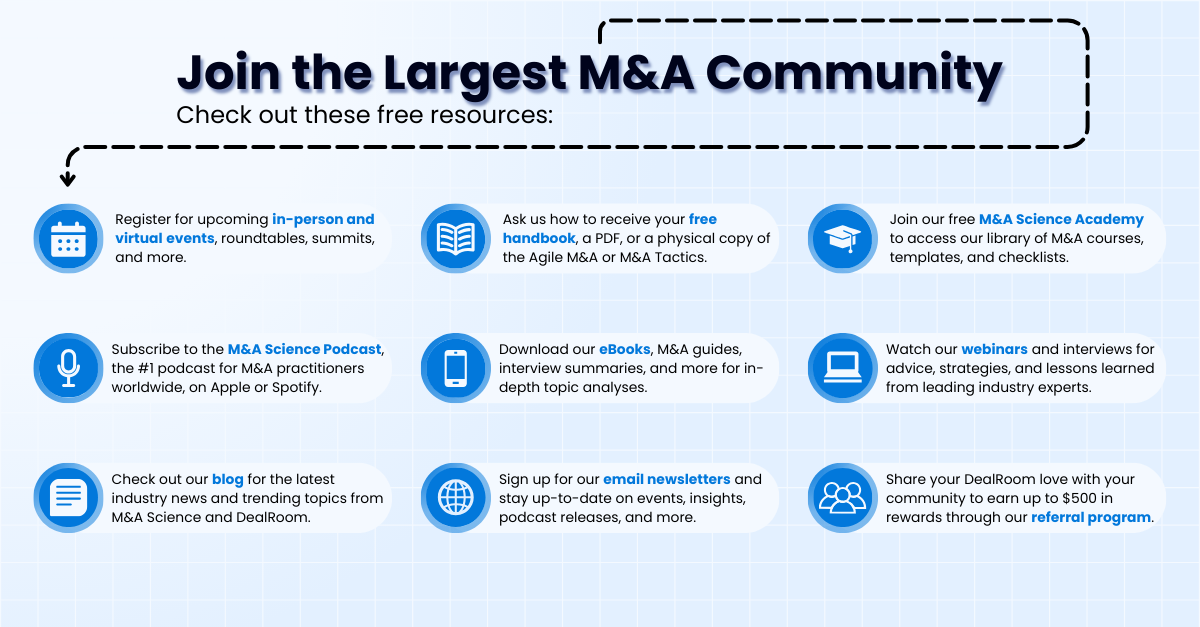 DealRoom's continuous support throughout onboarding means clients can fully leverage the platform's features, resulting in more effective and efficient M&A activities. Follow our lead for a more structured and thorough process as DealRoom ensures its customers are well-prepared to accomplish successful transaction outcomes.
