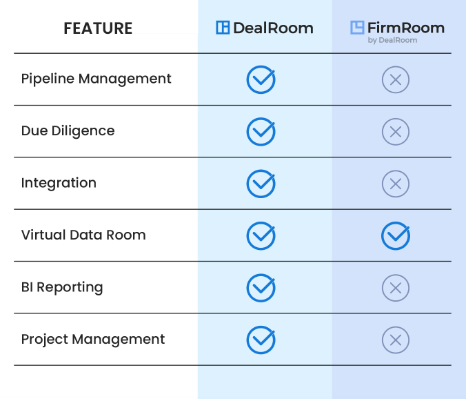 We often get questions from M&A teams for more clarity on the difference. So, we thought we’d write a blog to orient you. In short, the DealRoom M&A Platform is the #1 platform for Buyer-Led M&A™, providing end-to-end M&A lifecycle management. On the other hand, FirmRoom platform is a virtual data room. Let's dive in and explore the key differences between these two products to help you make an informed decision.