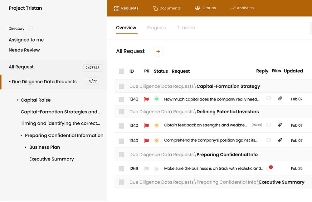 DealRoom is a project management platform designed for M&A and related transactions. Any company involved in the equity fundraising process can benefit from the due diligence capabilities it provides.