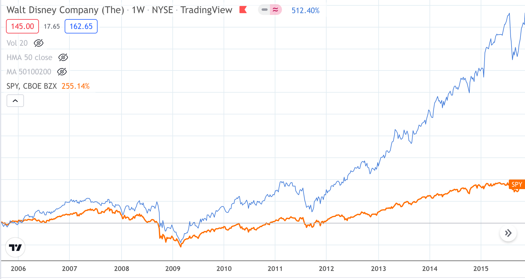 Or to put it in another way, Disney’s compounded annual growth exceeded 14%, while the overall market growth rate compounded was a little under 5%.