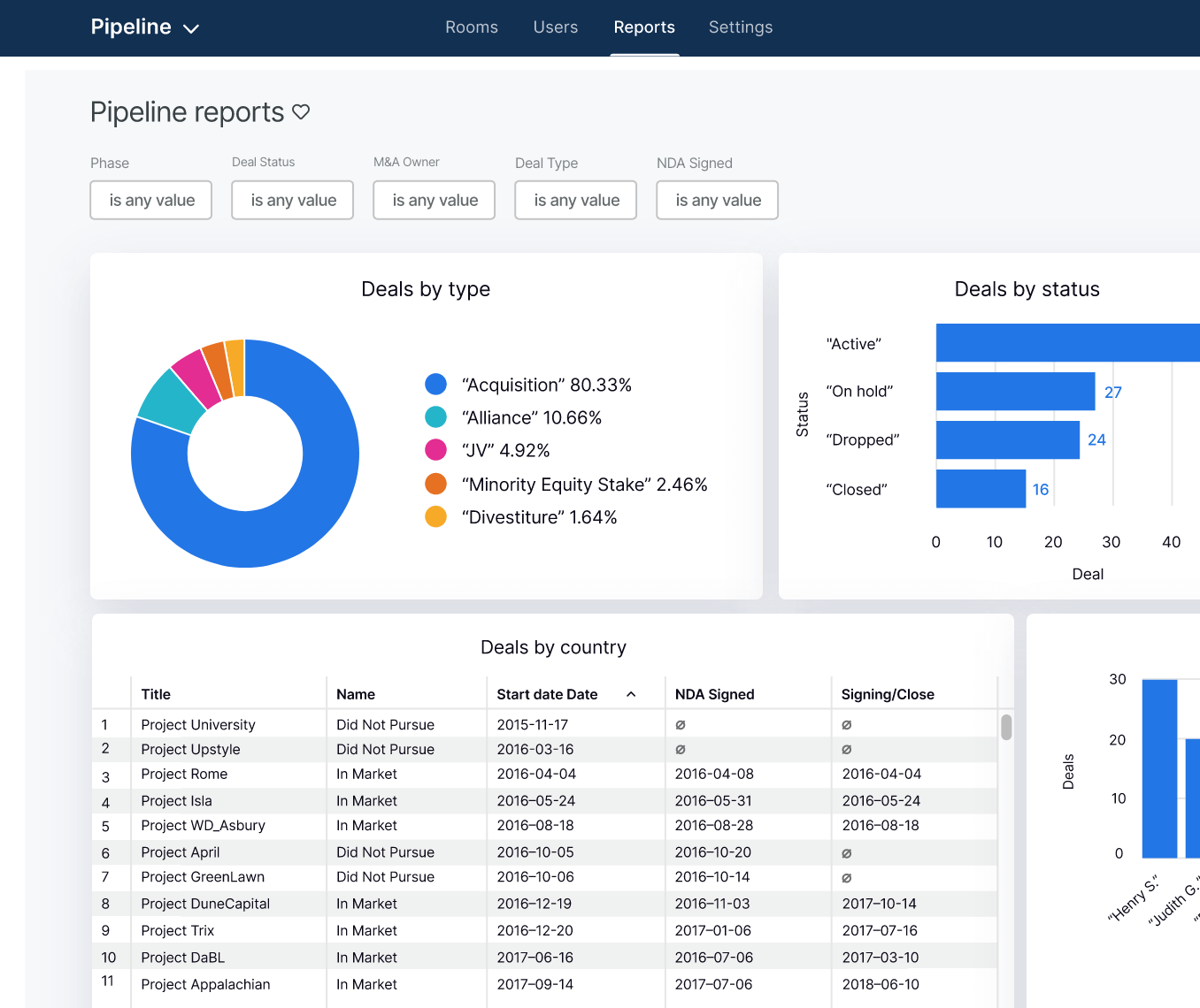Speed up your process with DealRoom’s library of pre-made templates that ranges from due diligence, form of LOI, flows of funds, to integration and more.